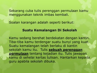 Translations in context of SEJARAH BERULANG KEMBALI in malay-english. Permulaan karangan yang berkesan akan menarik minat pembaca pada karangan kamu. Look through examples of imbas kembali translation in sentences listen to pronunciation and learn grammar.